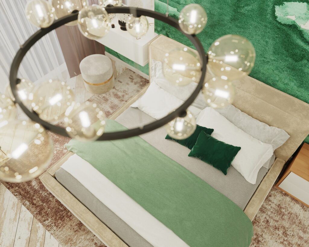 Natural colors were chosen as the main ones in the design – rich emerald, light wood, cream shades, and all shades of white, as the family prefers calmness and conciseness. Separate accent elements in the form of decor, textiles or small areas in the apartment are responsible for the brightness. From live plants, as an element of saturation of the interior and decor, it was decided to refuse, considering the preferences of the pet – the Customer’s cat.