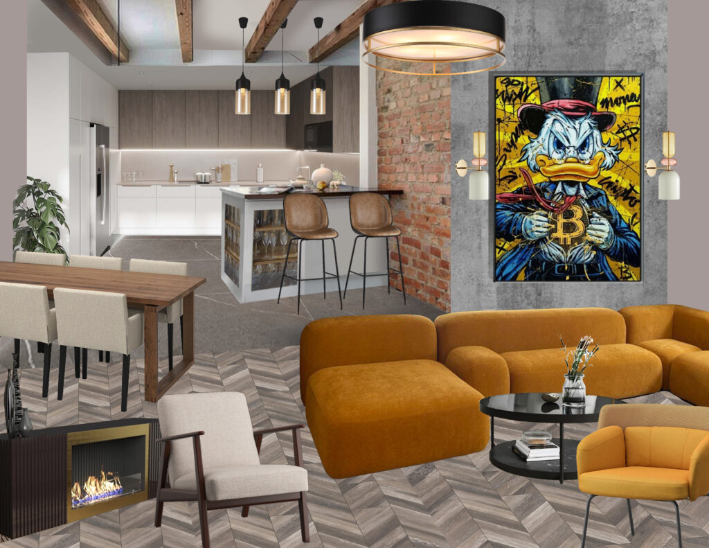The heart of the home is an eclectic kitchen, combining diverse textures, materials, and bold color contrasts. Soft, natural tones are paired with vibrant accents, creating a dynamic yet balanced atmosphere. Unexpected design combinations and statement elements add character and individuality, reflecting the lifestyle of an active and creative family.